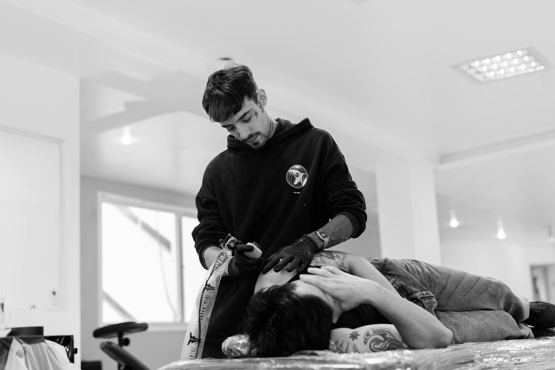 Su trabajo se enfoca principalmente en el blackwork, el tatuaje tradicional y una fusión entre blackwork y dotwork, combinando contraste, textura y lectura visual limpia. Cada pieza es abordada como un diseño único, priorizando la adaptación al cuerpo y la intención detrás de cada línea.